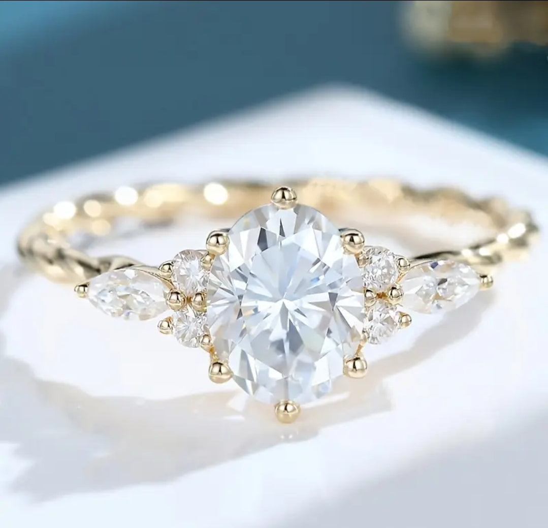 Expertly crafted with a 14k golden plated twisted band design, this sparkling halo ring features an oval-cut synthetic zirconia center stone surrounded by round brilliant diamonds. Perfect for weddings or engagements, this ring adds elegance and sophistication to any outfit. Remove before bathing or sleeping to maintain its quality.
