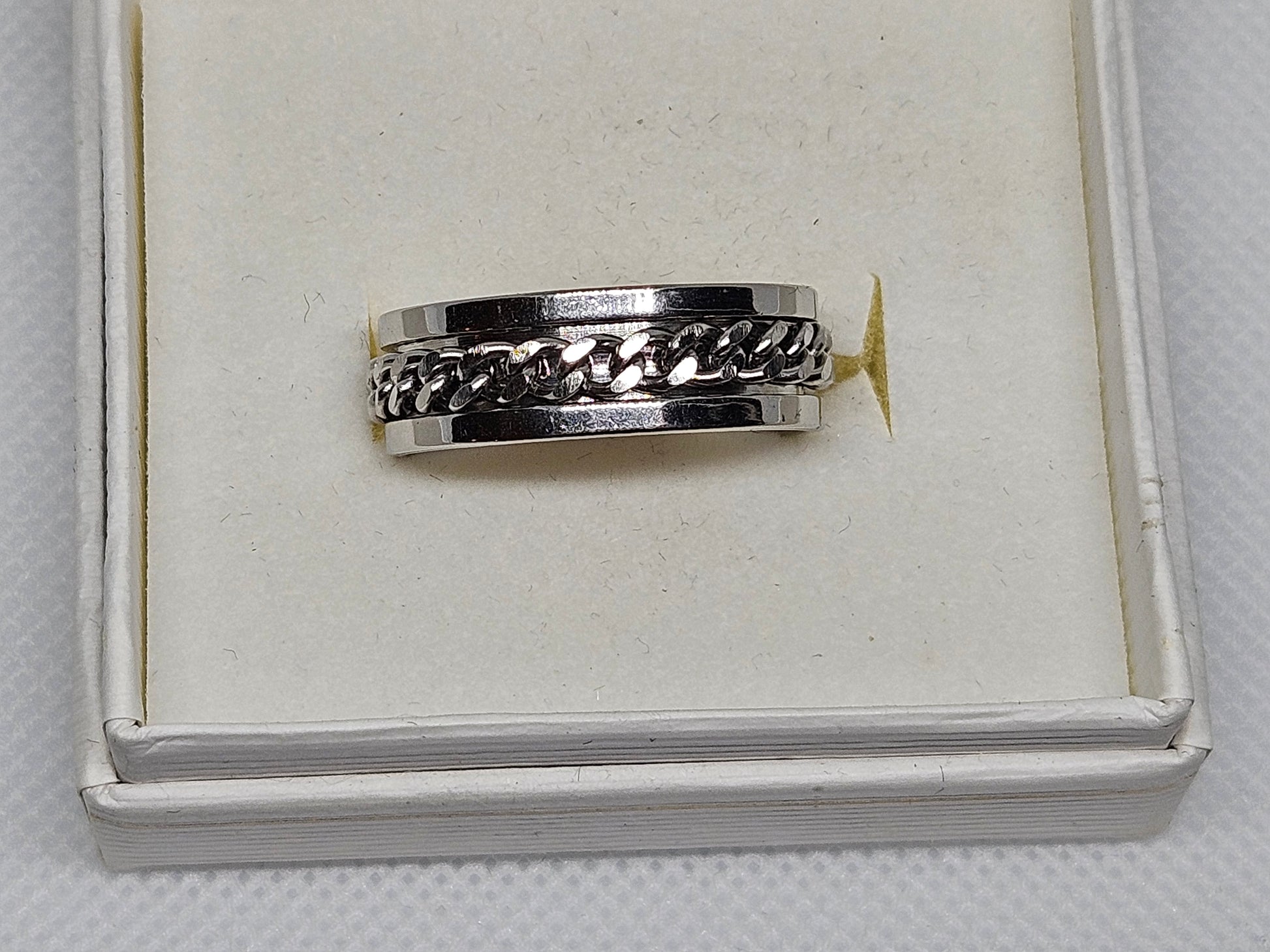 This Mens Fidget Ring is crafted from fashion stainless steel and features a rotatable chain design. Measuring 8mm, it serves as a multifunctional fidget spinner ring that provides anxiety relief and makes a perfect power sense gift for men. Remove before bathing or exercise.