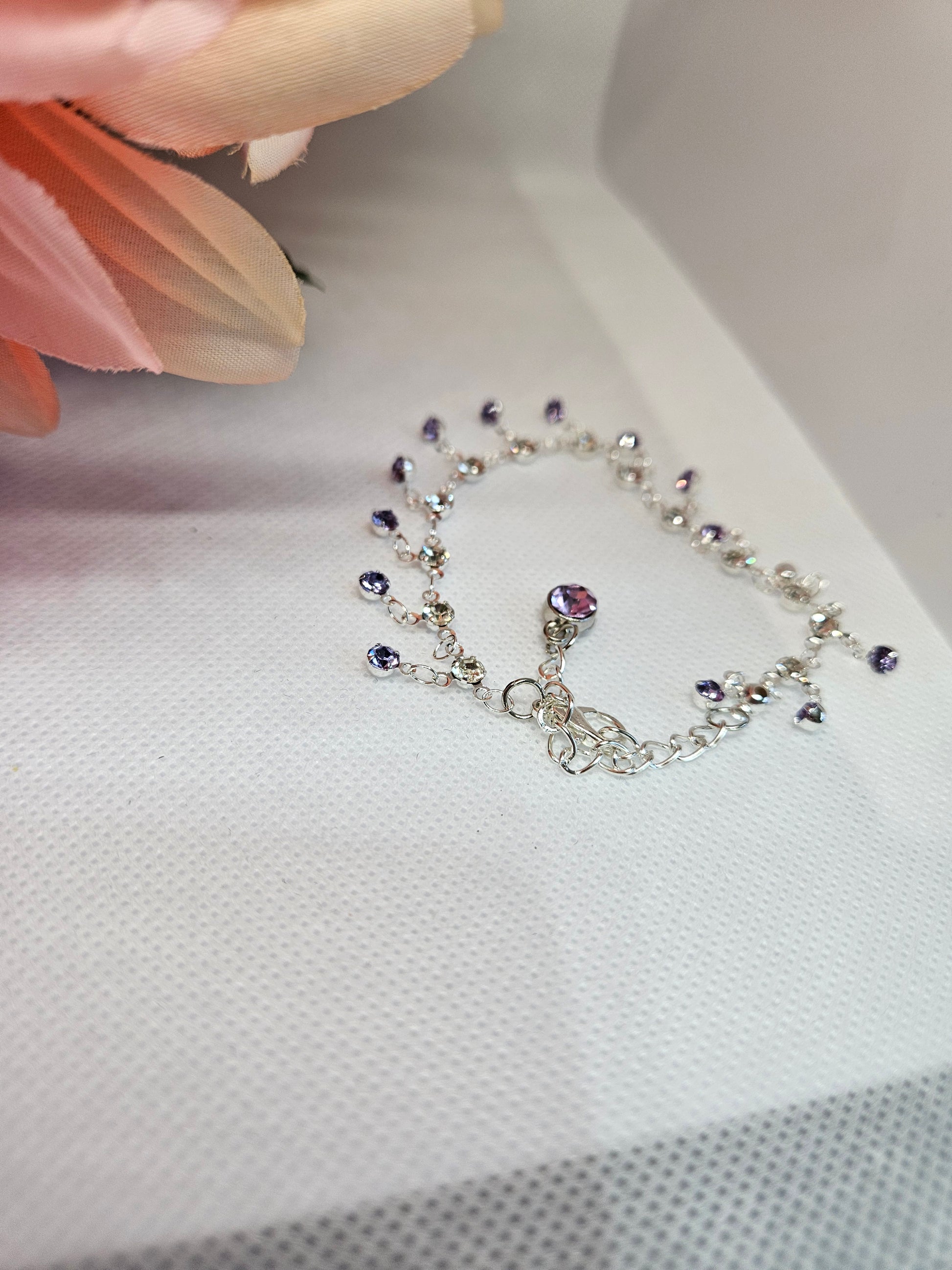 This elegant bracelet features purple and white Zirconia stones on a silver chain, with beautiful purple drop Zirconia. The perfect accessory for adding a touch of sophistication to any outfit. Exude confidence and style with this stunning piece.
